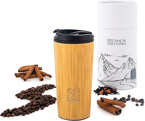 santai living kaffeebecher fur unterwegs coffee to go bambus thermobecher 400 ml aus edelstahl mit doppelwand isolierung 100 auslaufsicher thermo fur kaffee oder tee amazon de kuche haushalt wohnen
